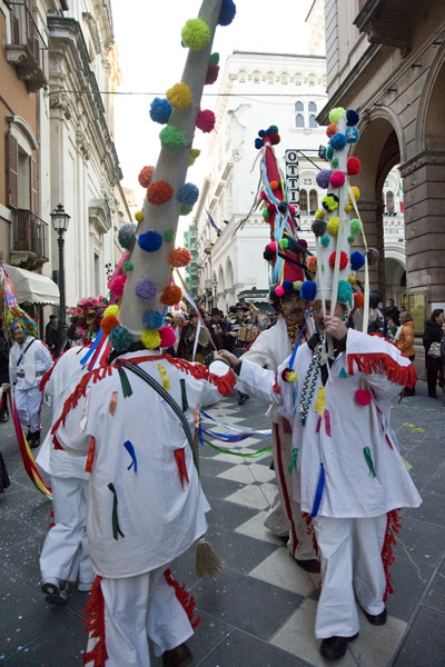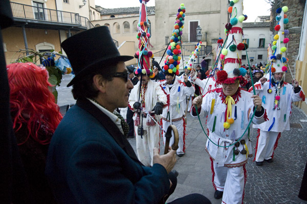 3. Carnevale inizia dopo Sant'Antonio Abate. Dei tre giovedì, degli amici, dei parenti e grasso, solo l'ultimo sopravvive appieno. I balli proliferavano a suon di saltarella, prendevano anche il nome di trescune come l'omonima danza. Naturalmente de Carnevale ogne burle vale ... La mascherata è un uso universale con molte varianti e variazioni, nessuna delle quali somiglia ai carnevali pseudoviareggini o pseudobrasiliani o peggio pseudoveneziani che ora sono diventati uno stereotipo comune grazie alla poca cultura, anzi ignoranza, dei mezzi di comunicazione che li propone come modelli.