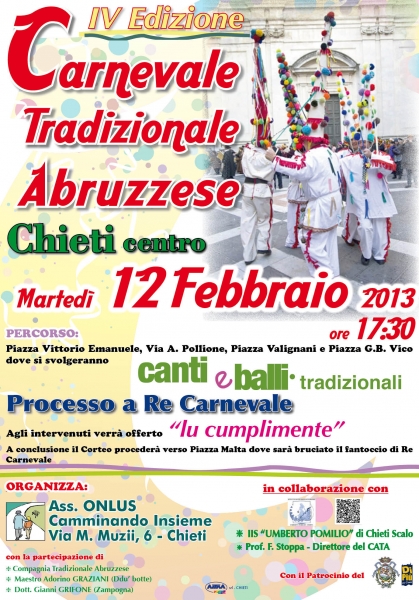 4. La versione del carnevale conosciuta e praticata in Abruzzo consiste in varie fasi che mescolano riti molto antichi, quali il canto dei mesi (mascherata dei mesi, un tempo molto comune ovunque) e il palo intrecciato (danza propiziatoria di nastri avvolti e svolti intorno a un palo, anche questa ampiamente distribuita nel mondo occidentale), messinscene di carattere medievale come la carnevalata, la morte di Carnevale (o lo scaccione, versione meno cruenta), il funerale e il rogo di Carnevale, cortei rumorosi di caccavelle varie al grido di fora fora carnevale (significato apotropaico). Inoltre balli e canti di stile ottocenteschi (ma anch'essi di origine bassomedievale) come le arie di carnevale e la quadriglia figurata di piazza e ovviamente saltarella.