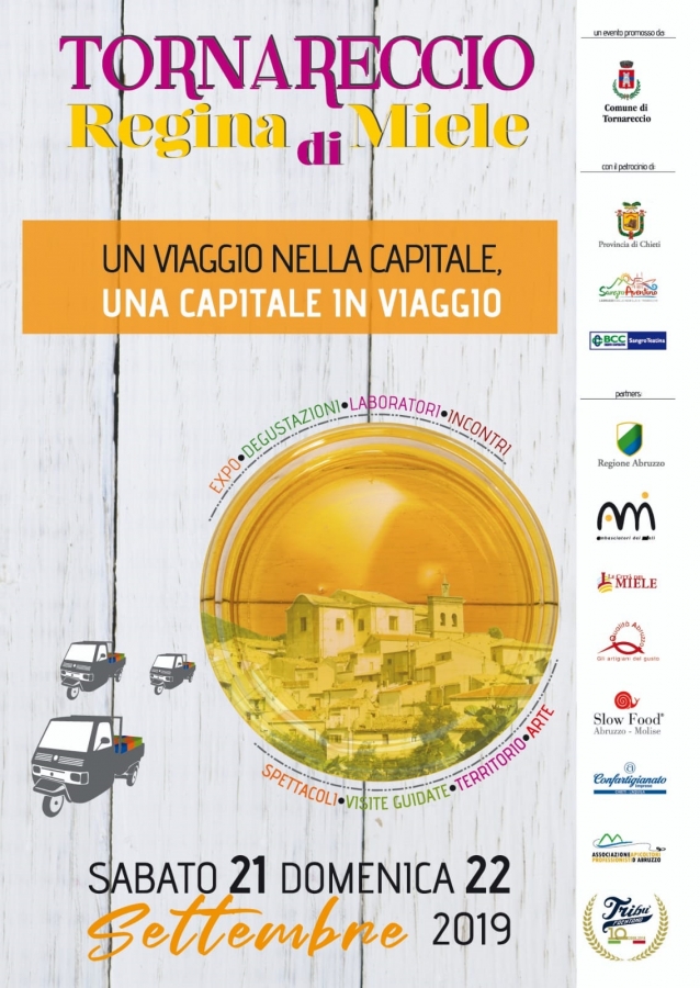 “Un viaggio nella capitale, una capitale in viaggio” sarà il filo conduttore dell’edizione 2019 di Tornareccio Regina di Miele, la fortunata rassegna gastronomica in programma sabato 21 e domenica 22 settembre prossimi organizzata e promossa dal Comune di Tornareccio, che crede fortemente in un evento pensato per valorizzare tutto il paese, le sue attività produttive e le sue eccellenze. Per il tredicesimo anno consecutivo, la “capitale abruzzese del miele” – un primato legato ad una produzione di qualità e di quantità che non ha pari in Abruzzo – accoglierà migliaia di visitatori anche da fuori regione desiderosi di fare un “viaggio nella capitale” tra colorati stand, degustazioni, ristorazione, laboratori, incontri, spettacoli, visite guidate, territorio e arte.