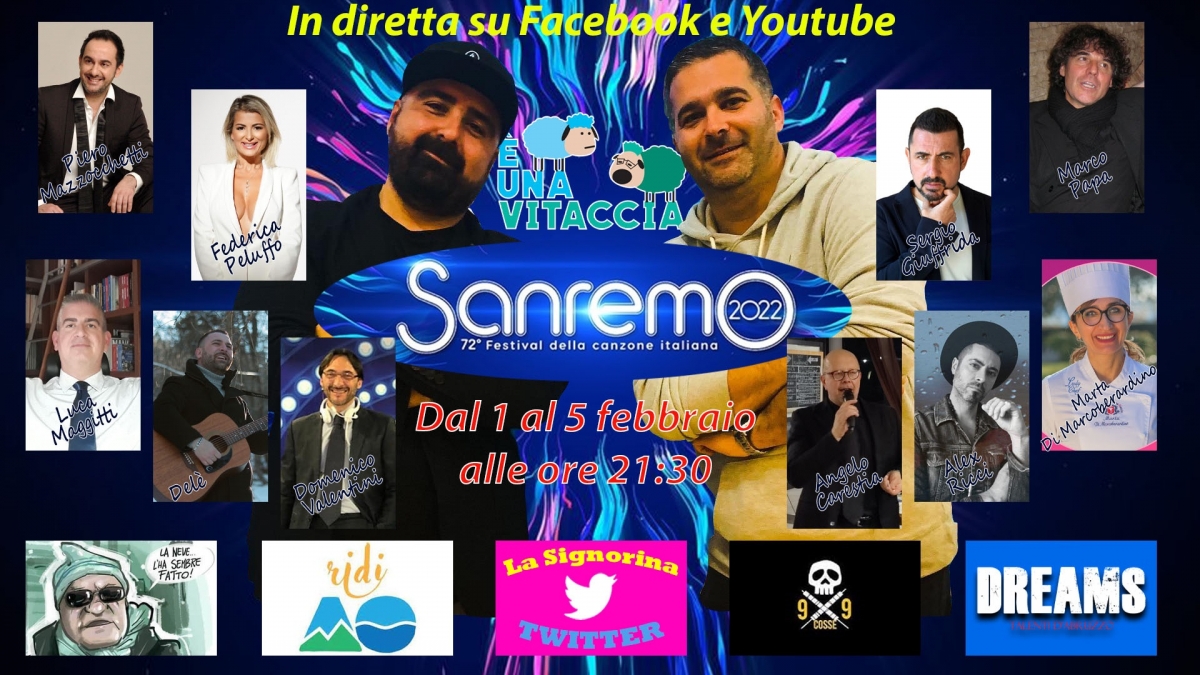 Con queste parole il duo comico abruzzese formato da Lucio Rasetti e Fausto Verdecchia annuncia la conferma del format “E’ una vitaccia a Sanremo”, dedicato alla più importante kermesse canora di sempre nel panorama nazionale che, dopo il successo riscontrato nelle tre precedenti edizioni, verrà di nuovo proposto in diretta sulla pagina Facebook di “E’ una vitaccia” (e in contemporanea sul canale ufficiale di Youtube) nelle serate di martedì 1, mercoledì 2, giovedì 3 e sabato 5 febbraio, a partire dalle ore 21.30.