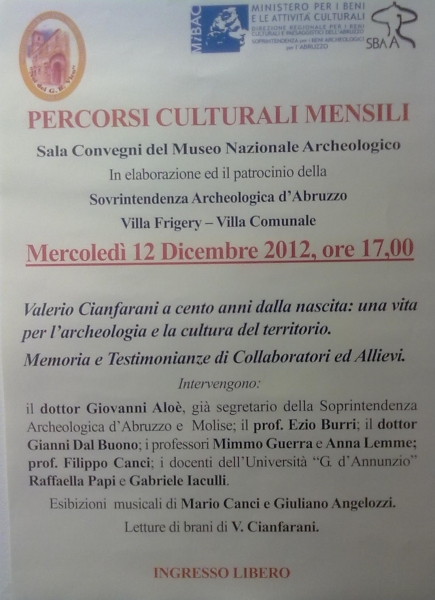 Per iniziativa dell’Associazione “Noi del G.B.Vico” e della Soprintendenza ai beni archeologici d’Abruzzo di Chieti sarà ricordato, in uno dei ricorrenti Percorsi Culturali Mensili dell’associazione degli ex allievi e docenti del Liceo Classico, il primo centenario della nascita di Valerio Cianfarani (Roma 13 dicembre 1912 – Roma 8 dicembre 1977).