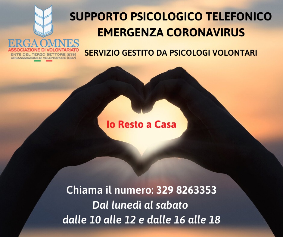 Gli psicologi volontari dell'Associazione Erga Omnes di Chieti, presieduta da Pasquale Elia, offrono un servizio gratuito di supporto psicologico telefonico, rivolto a tutti i cittadini che hanno bisogno di un sostegno per imparare a gestire dubbi, timori e paure che possono insorgere in ognuno di noi in questo periodo. Uno spazio di ascolto dove i professionisti volontari sono pronti a fare la loro parte in questa situazione di emergenza.