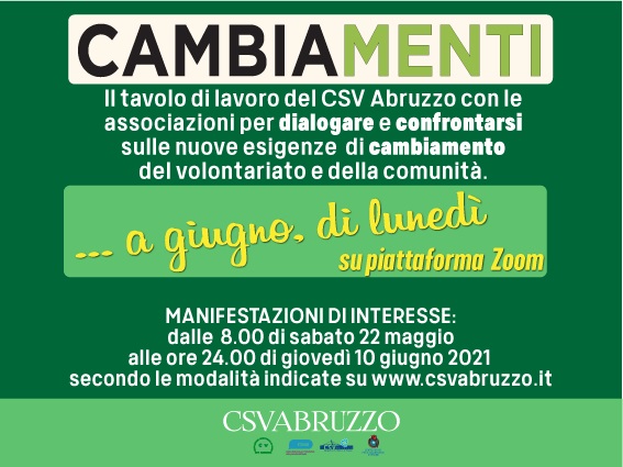 Per tutte le associazioni di volontariato c’è una interessante opportunità con “Cambiamenti”, il tavolo di lavoro del CSV Abruzzo per dialogare e confrontarsi sulle nuove esigenze di cambiamento del volontariato e della comunità.