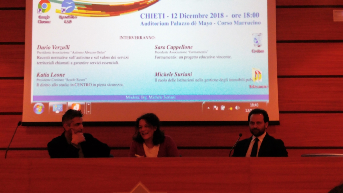 Presenti: Sara Cappellone Presidente Associazione FormaMentis; Dario Verzulli Presidente dell’Associazione “Autismo Abruzzo Onlus”; Katia Leone Presidente Comitato Scuole Sicure e l’Ing. Michele Suriani moderatore e relatore sul ruolo delle Istituzioni nella gestione degli immobili pubblici.