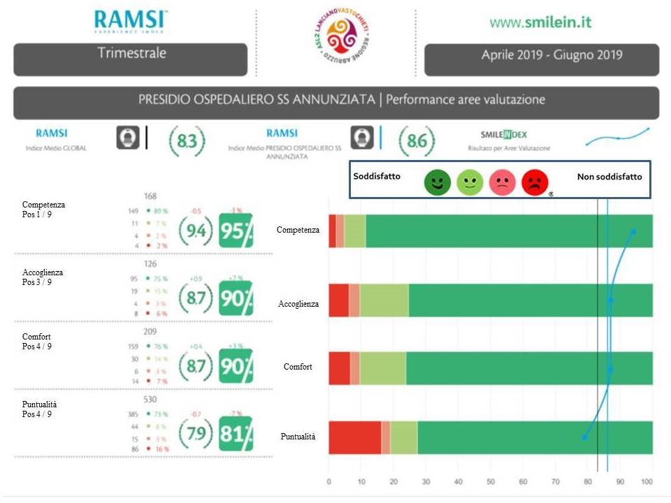 Quattro totem con pulsantiere da quattro tasti ciascuna, che vanno dal colore verde (giudizio totalmente positivo) al colore rosso (totalmente negativo), sono state posizionate lo scorso marzo nel reparto dell’ospedale di Chieti diretto da Domenico Genovesi. Ciascuno dei totem pone una domanda specifica sulla puntualità del reparto (“L’orario del tuo appuntamento è stato rispettato?”), l'accoglienza (“Oggi ti sei sentito accolto come persona?”), la professionalità (“Oggi sono stati competenti con te?”) e il comfort degli ambienti (“Gli ambienti sono confortevoli?”).