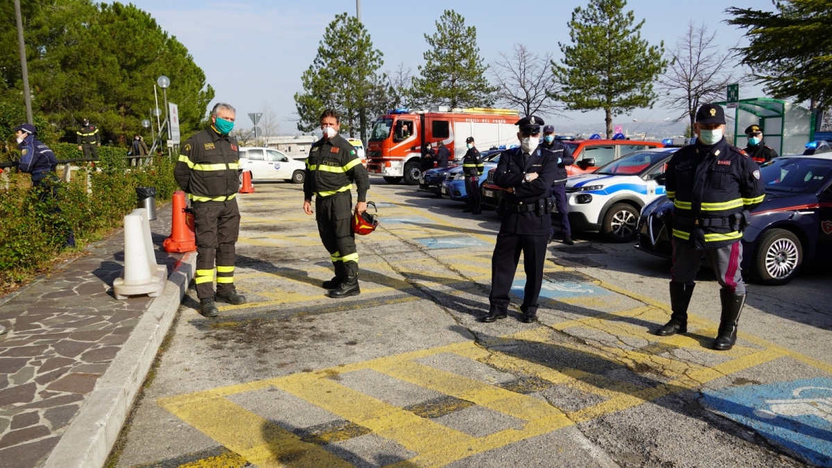 E’ stato denso di significato e di emozione l’omaggio reso questa mattina dalle Forze dell’Ordine agli operatori e ai malati del “SS. Annunziata” di Chieti, in prima linea nell’emergenza Coronavirus.