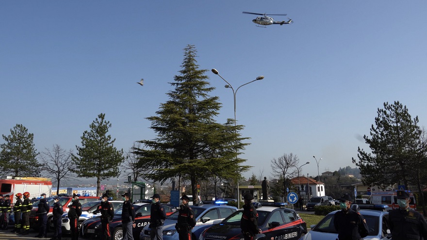 Tutti sull’attenti, volti contratti, silenzio composto, interrotto solo dal rombo dell’elicottero che volteggia intorno all’ospedale più volte e poi si ferma, come a simboleggiare un inchino per tutti quelli che sono là dentro.