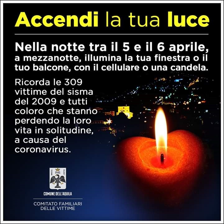 E’ stato chiesto a tutti, attraverso un appello sottoscritto dai Comitati dei familiari delle vittime e dal sindaco Biondi, di accendere un lume o il proprio cellulare alla finestra, nella notte tra il 5 e il 6 aprile per commemorare le vittime del sisma e tutti coloro che in questi giorni stanno perdendo la vita in solitudine a causa del Coronavirus.