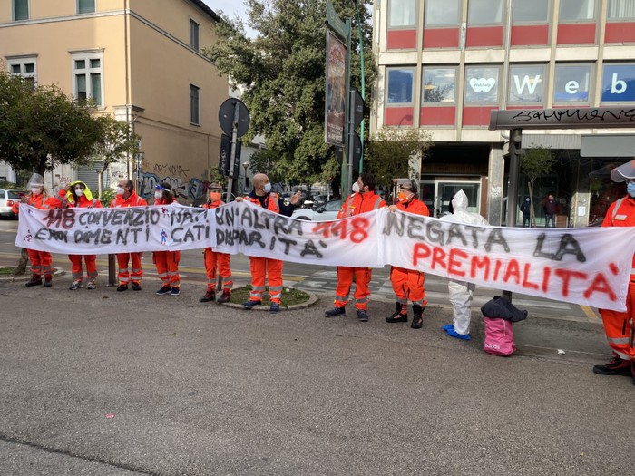 Manifestazione, davanti alla sede dell'assessorato regionale alla Sanità di via Conte di Ruvo a Pescara, dei medici convenzionati del 118 delle quattro Asl abruzzesi per protestare contro la decisione di escluderli dalle premialità concesse dalla Regione ai dipendenti del settore sanitario, per il lavoro portato avanti nel periodo del lockdown di primavera a causa dell'emergenza Covid 19.