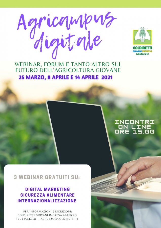 Si tratta di tre incontri a distanza sulle tematiche emerse da un'indagine del fabbisogno formativo degli under 35. L’Agricampus digitale – questo il nome dell’iniziativa di Coldiretti Giovani Impresa Abruzzo – inizierà il 25 marzo alle 15 su piattaforma Lifesize.