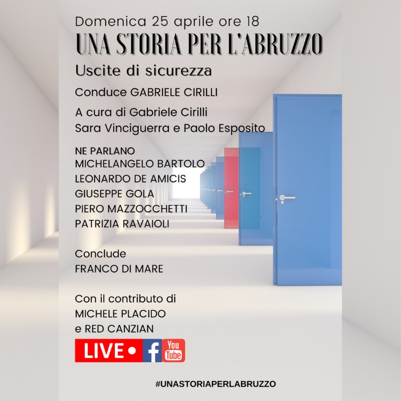 “Uno zibaldone che rimarca ancora una volta lo stile di “Una storia per l’Abruzzo” – commentano gli ideatori Gabriele Cirilli, Paolo Esposito e Sara Vinciguerra – e quella necessità di ascoltare visioni differenti, unendo settori apparentemente lontani, ma che insieme danno la visione per il futuro. E’ stato quindi naturale dedicare questa terza puntata ad “uscite”, al plurale, e a quel viaggio che traccia la strada per individuarle, in una giornata come quella del 25 aprile dedicata alla liberazione del nostro Paese e che anticipa il ritorno alla zona gialla per molte regioni italiane.”