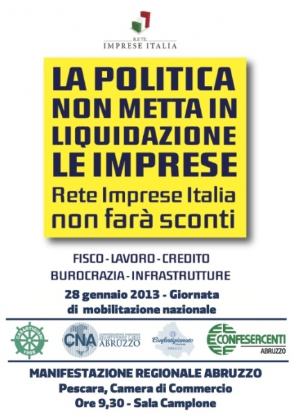 Le associazioni provinciali di CNA, Casartigiani e Confartigianato Confesercenti, invitano a partecipare alla giornata di mobilitazione nazionale delle piccole e medie imprese, lunedì 28 gennaio 2013 alle ore 10,00 presso la sala Cascella della CCIAA di Chieti in P.zza G.B. Vico.