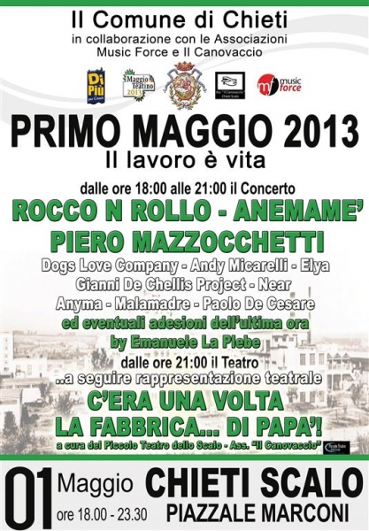 “Primo Maggio 2013. Il lavoro è vita”, questo il titolo dell’evento musicale che si terrà il prossimo 1 maggio a Chieti Scalo, organizzato dal Comune di Chieti e dalle associazioni Music Force e Il Canovaccio. Un’iniziativa che vedrà sul palco di piazzale Marconi numerosi artisti abruzzesi che si esibiranno insieme per festeggiare in musica, per la prima volta a Chieti, la giornata dedicata al lavoro e a tutti i lavoratori.