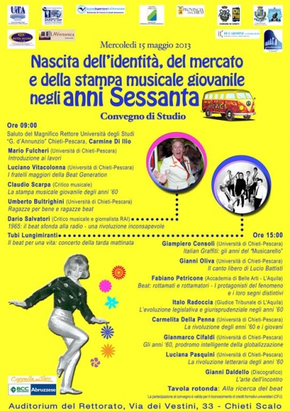 Mercoledì 15 maggio, all’Auditorium del Rettorato dell’ Università degli Studi ‘Gabriele d’Annunzio’ (via dei Vestini 33, Chieti Scalo) si svolgerà il Convegno di Studi su Nascita dell’identità , del mercato e della stampa musicale giovanile negli anni Sessanta, organizzato dal Dipartimento di Scienze Psicologiche, Umanistiche e del Territorio.