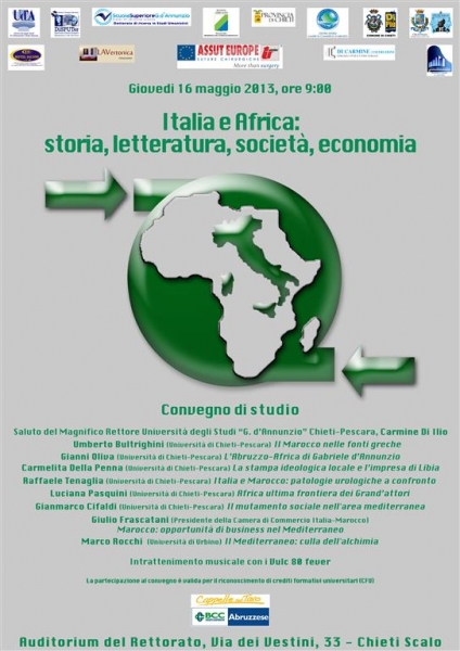 Giovedì 16 maggio, all’Auditorium del Rettorato dell’Università degli Studi ‘Gabriele d’Annunzio’ (via dei Vestini 33, Chieti Scalo) si svolgerà il Convegno di Studi su Italia e Africa: storia, letteratura, società , economia, organizzato dal Dipartimento di Scienze Psicologiche, Umanistiche e del Territorio.