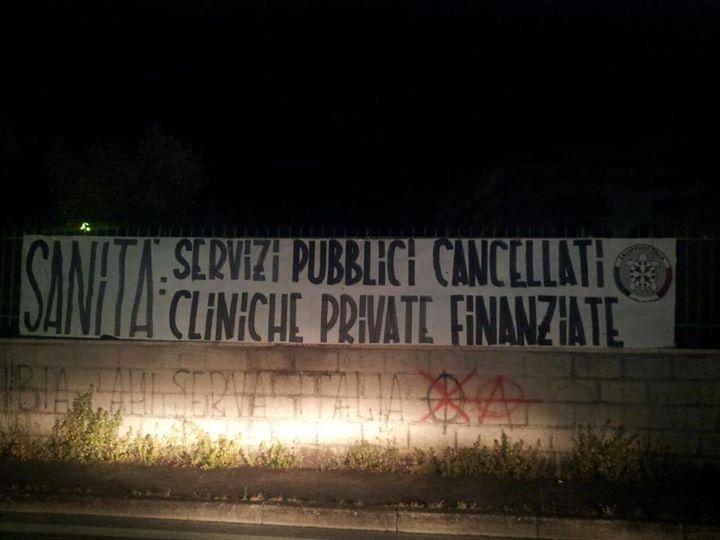 Protesta del movimento CasaPound Italia contro la decisione dell'amministrazione regionale abruzzese di aumentare di oltre 7 milioni di euro il budget per le cliniche sanitarie private accreditate, che sale così da 124 a 131,7 milioni di euro. In nottata numerosi striscioni e volantini sono stati affissi presso gli ospedali pubblici abruzzesi, tra cui quelli di Chieti e Lanciano, per protestare contro questo provvedimento, che giunge in un momento in cui il settore della sanità pubblica abruzzese è oggetto di forti tagli, con la decisione di chiudere i punti nascita di Sulmona, Ortona, Atri e Penne.