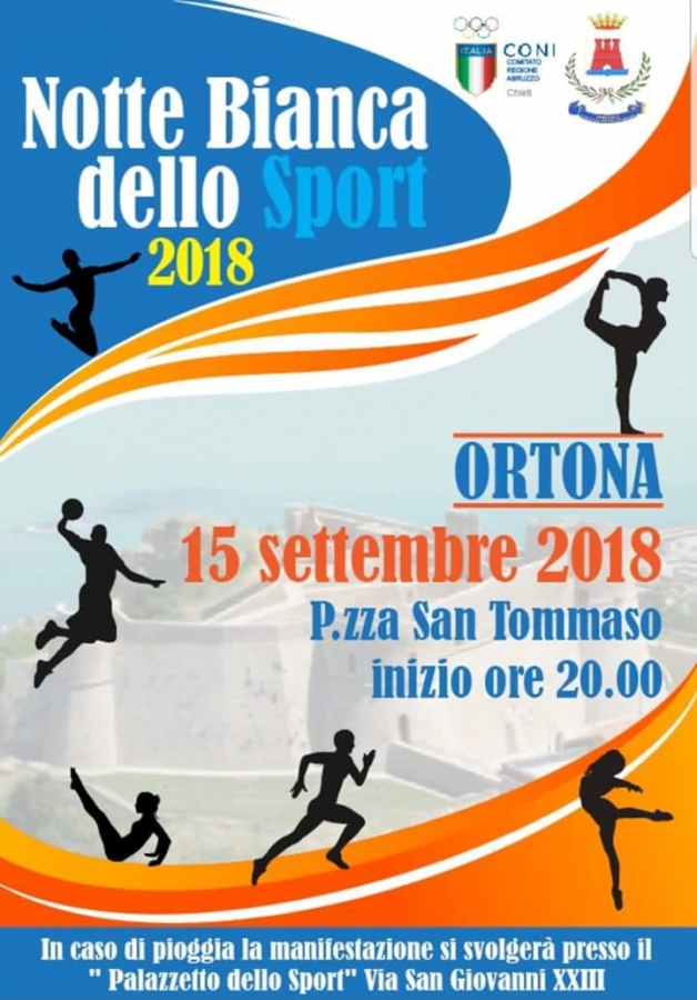 Una notte all'insegna dello sport,con il coinvolgimento delle associazioni sportive cittadine.La kermesse, organizzata dalla delegazione di Chieti del Coni Abruzzo in collaborazione con il Comune di Ortona, si svolgerà il prossimo 15 settembre nel centro cittadino che, per l'occasione si trasformerà in una sorta di stadio all'aperto, per accogliere dimostrazioni ed esibizioni oltre che per permettere ai presenti di provare alcune discipline sportive.