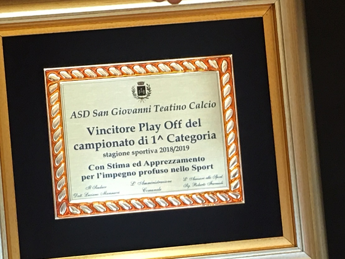 Bel corso di una cerimonia che si è svolta nella sala consiliare di Palazzo di Città , il sindaco Luciano Marinucci e l'assessore allo Sport Roberto Ferraioli hanno consegnato una targa speciale all'ASD San Giovanni Teatino Calcio vincitore dei play off del campionato di Prima Categoria stagione 2018/2019 con il salto nel campionato di Promozione.