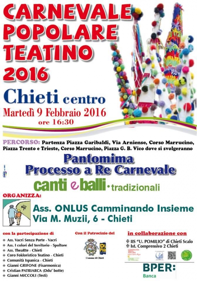 Martedì 9 febbraio dalle ore 16.30, con partenza da Piazza Garibaldi, si svolgerà il tradizionale Corteo di Carnevale, organizzato dall’Associazione “Camminando Insieme”, presieduta da Anna Vaccarella, con il patronicio del Comune di Chieti, che si snoderà per le vie del Centro Storico: via Arniense, Corso Marrucino, per approdare in Piazza G. B. Vico dove si darà vita alla Pantomima del processo e della condanna di Re Carnevale.