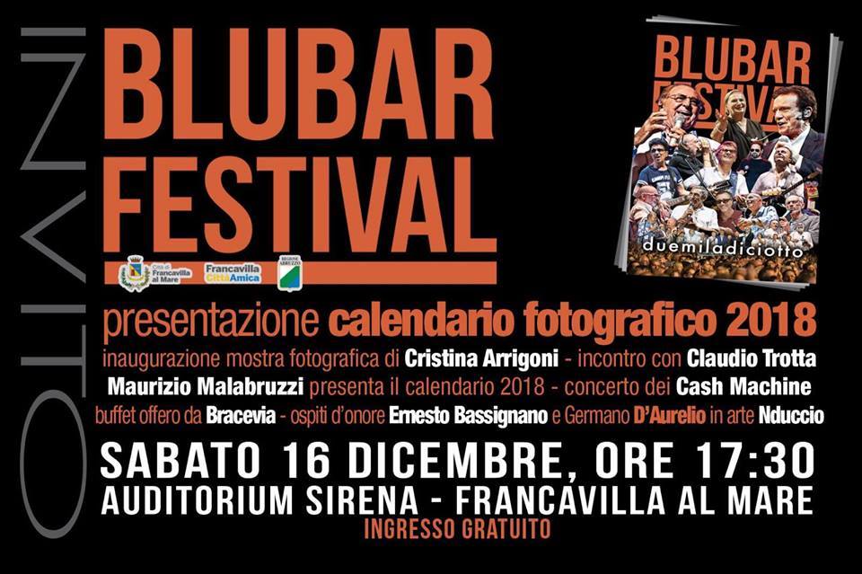 Si terrà sabato 16 dicembre a Francavilla al Mare la presentazione del calendario fotografico 2018 del Blubar Festival. L'evento, che sarà a ingresso libero, si sposta quest'anno dal MuMi all'Auditorium Sirena, appena inaugurato in centro.