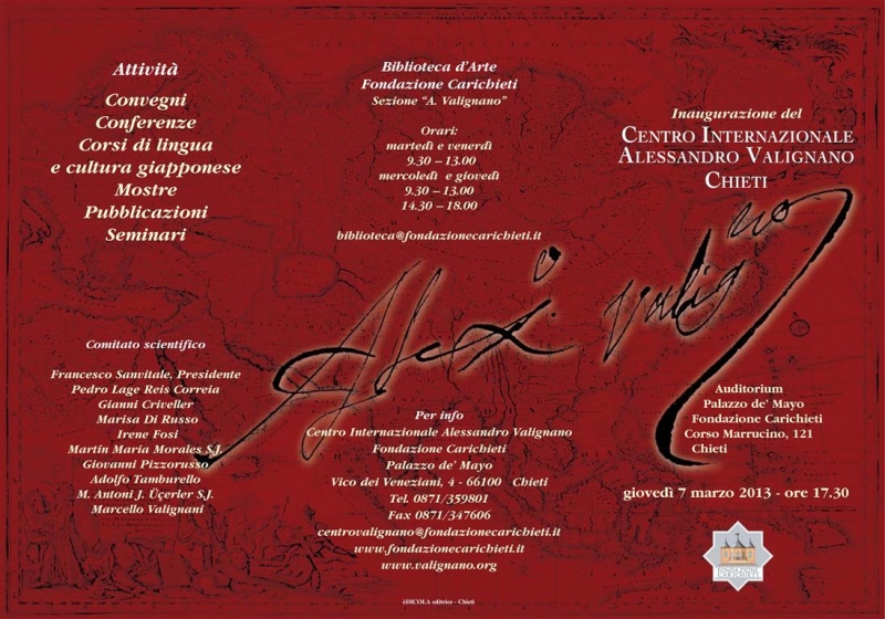 Verrà inaugurato giovedì 7 marzo, alle ore 17.30, presso l’Auditorium di Palazzo De Majo a Chieti, il Centro Internazionale Alessandro Valignano che ha tra i suoi obiettivi principali la promozione di studi e ricerche attraverso la realizzazione di iniziative culturali sulla figura del noto personaggio teatino (Chieti 1539- Macao 1606), che si distinse per la sua opera di evangelizzazione in Estremo Oriente “fondata sulla sua straordinaria capacità di favorire l’incontro di popoli lontani”.