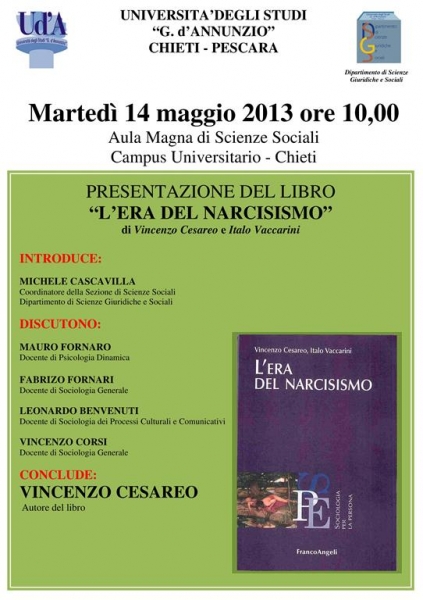 Sarà uno degli autori, Vincenzo Cesareo, a concludere l’incontro finalizzato proprio alla presentazione del volume “L’era del narcisismo” (edito da Franco Angeli), che si terrà presso l’Aula Magna di Scienze Sociali, nel Campus di Chieti, il prossimo martedì 14 maggio, alle ore 10.00.